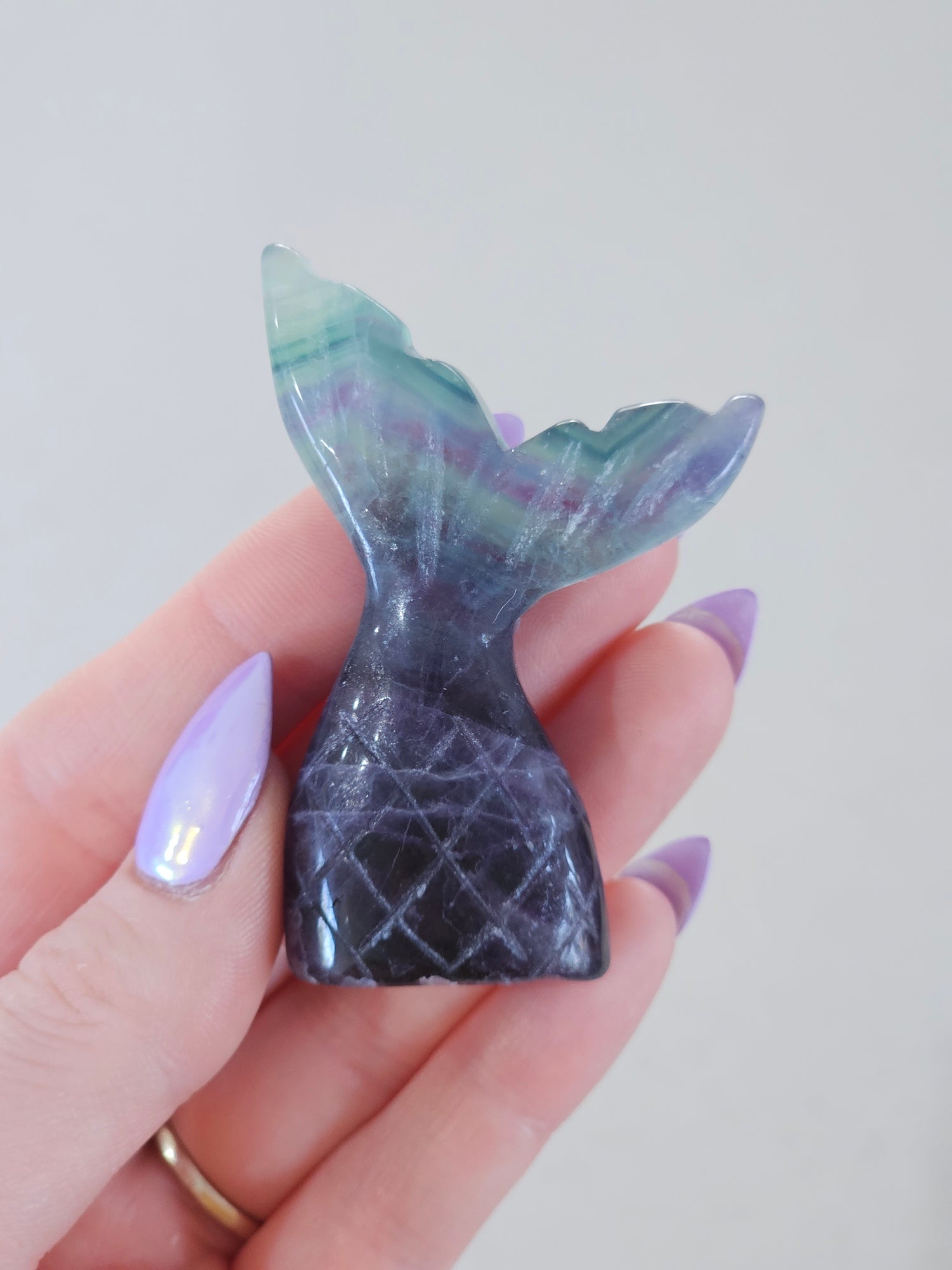 Carved into a magical mermaid tail, this Rainbow Fluorite piece beautifully showcases its natural bands of purple, green, and blue. Known as a stone of focus and insight, Fluorite helps clear the mind, bring order to scattered thoughts, and strengthen intuition.